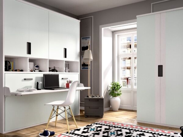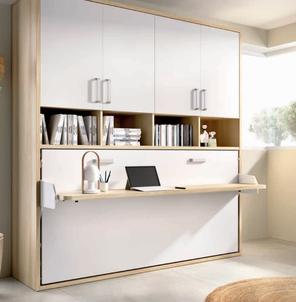 Cama abatible horizontal con armario superior, hueco de estanterías y práctico escritorio incorporado.