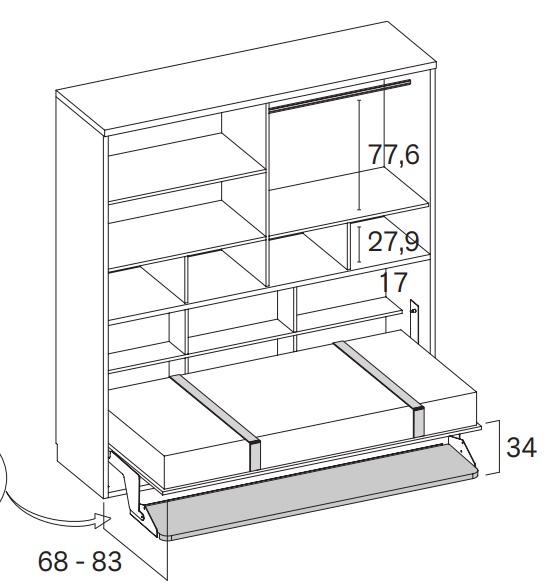 Para colchón de 90 x 190. Cinchas sujeta colchón, barandilla de seguridad, bloqueo de seguridad, patas ocultas regulables y bombín con sistema de retención, componentes metálicos en color blanco. Cama abatible con armario superior Rimobel es un producto nacional con 2 años de garantía.