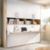 Cama abatible horizontal de 90×190 con armario de puertas plegables en la parte superior de 90×190 y pata que se baja automáticamente y se bloquea al descansar la base en posición horizontal .