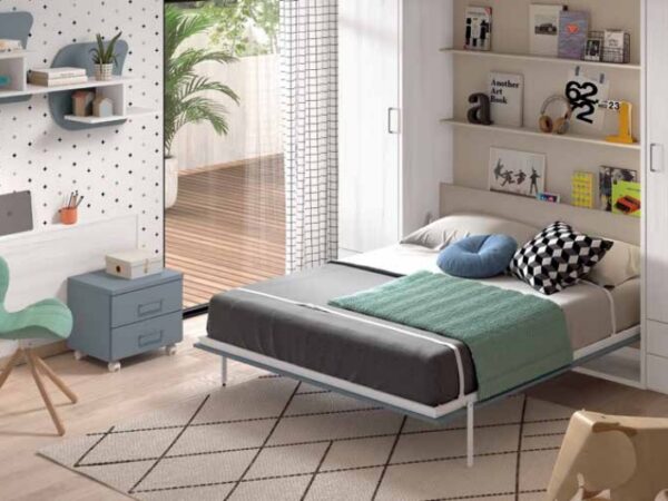 • Cama abatible vertical 135×190: Esta cama se pliega verticalmente, proporcionando una excelente solución para dormitorios con espacio limitado. Al estar oculta durante el día, permite utilizar el área para otras actividades, transformando el espacio según tus necesidades.