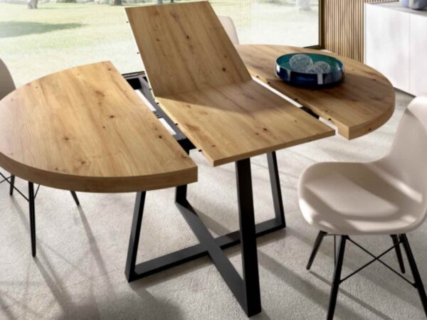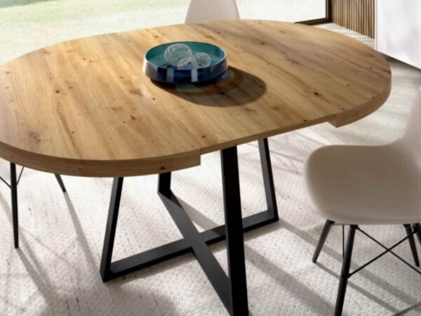 El diseño de la mesa redonda extensible, junto al color de sus acabados, la define dentro de un estilo industrial y personal.