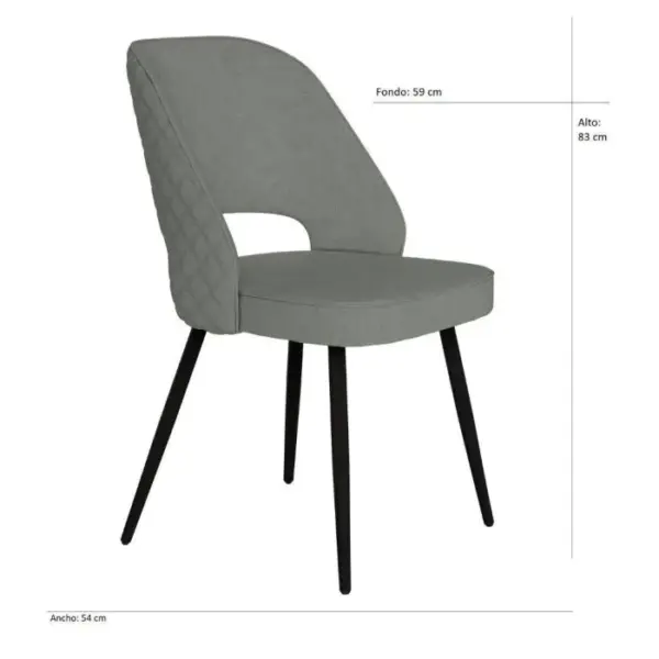 Silla con asiento y respaldo tapizado con estructura de metal y patas negra.